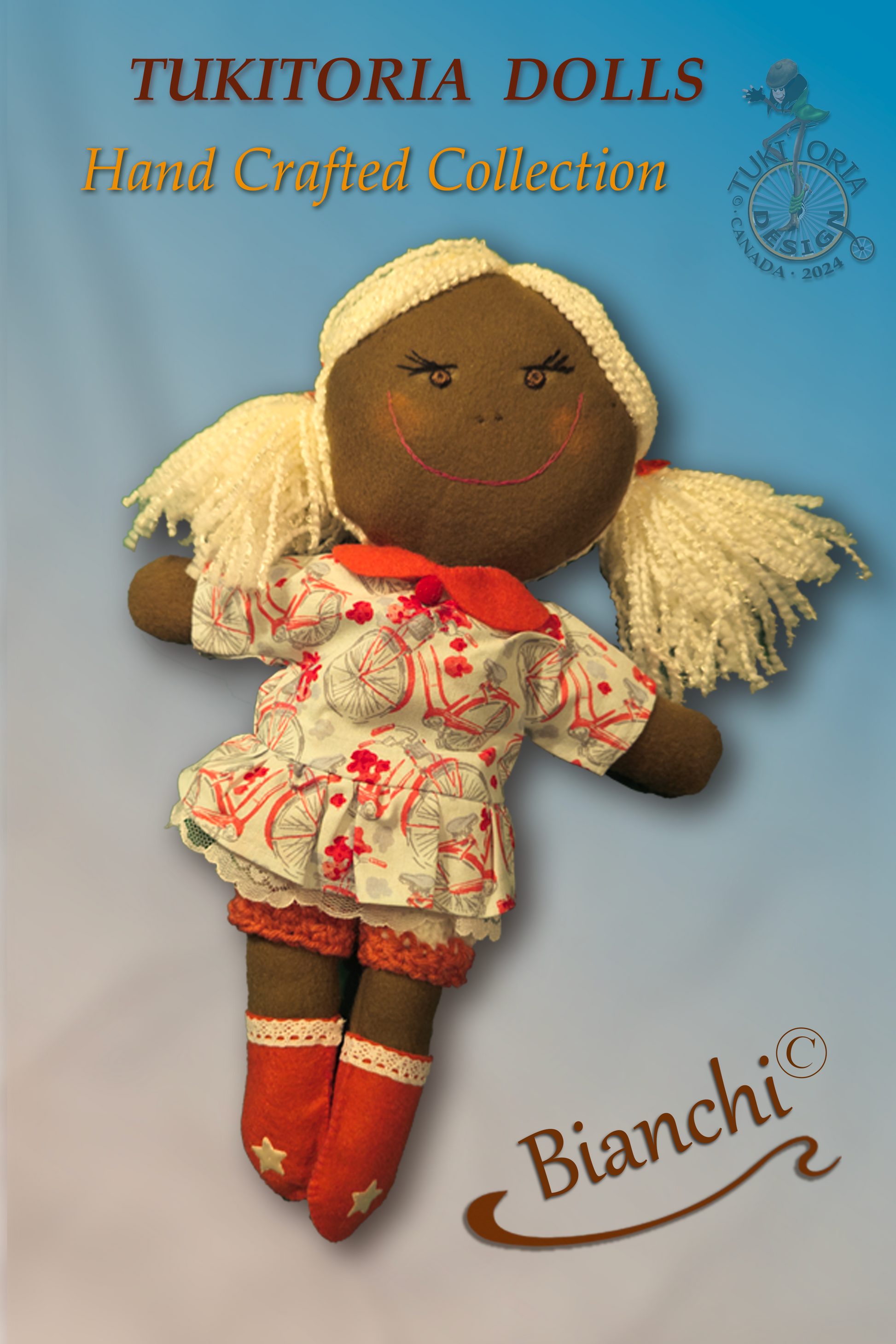 Bianchi is a handmade doll inspired by the iconic Bianchi bicycles, with her outfit, she embodies a sense of freedom and adventure reflecting her love for cycling and independence. Her energetic personality is as vibrant as the wind rushing past during a thrilling ride. Whether she's imagined cruising through city streets or taking on scenic mountain paths, Bianchi carries the spirit of the cyclist—focused, adventurous, and always ready for the next journey. Her design is a tribute to the passion for cycling, making her a dynamic companion for anyone who shares the love of the ride.